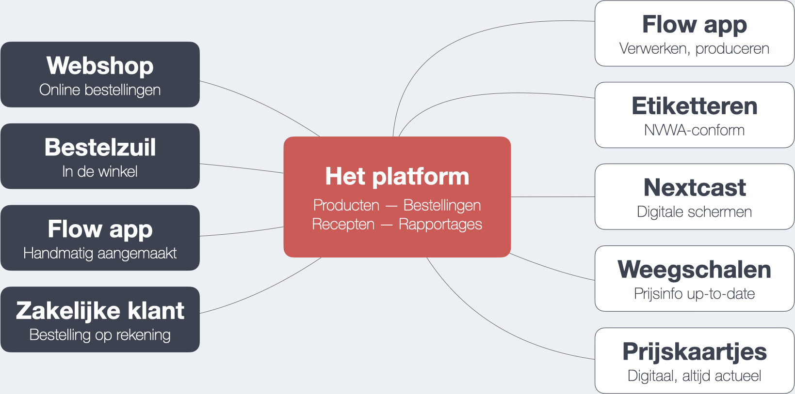 In de webshop, de Flow app en de bestelzuil. Maar ook in je weegschalen en digitale prijskaarten - die halen hun informatie automatisch op uit hetzelfde platform. Prijswijziging doorgevoerd? Direct overal bijgewerkt.